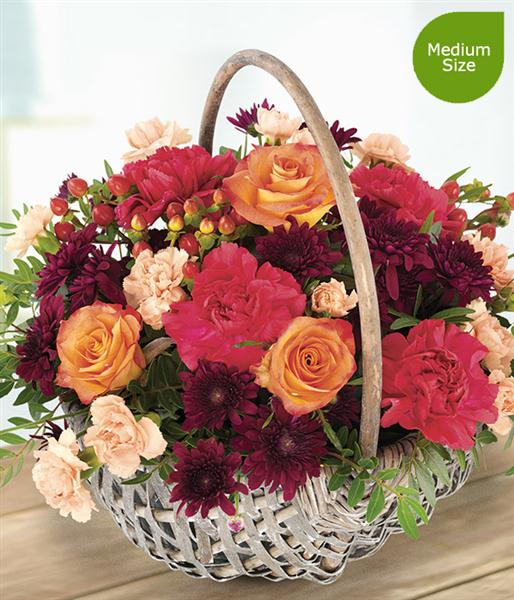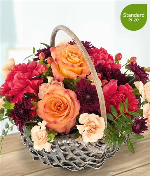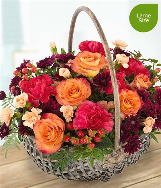 A simply stunning autumnal flower basket. With vibrant , rich autumnal colours consisting of a beautiful mix.