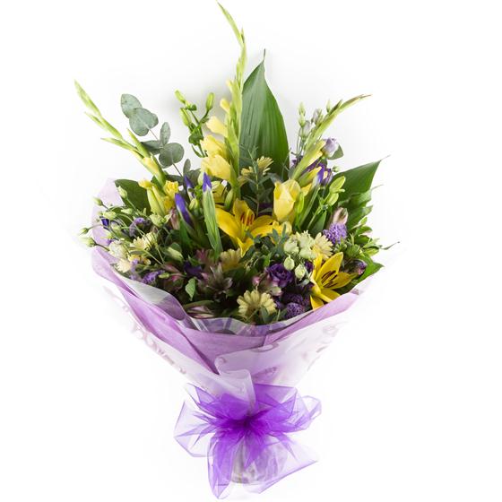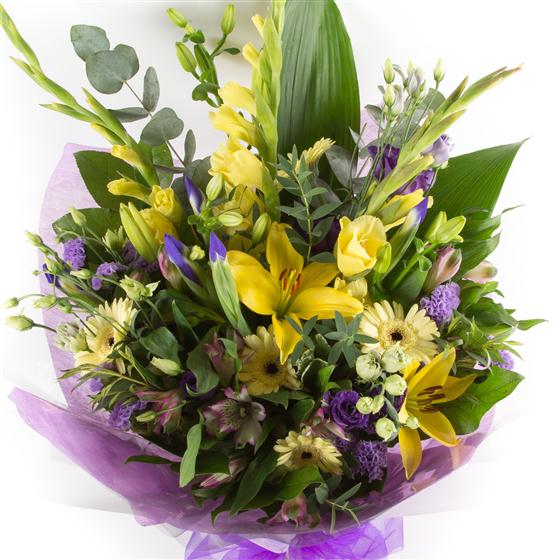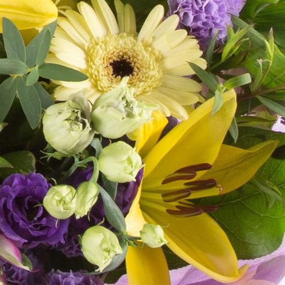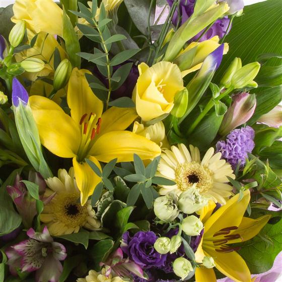 A large hand-tied bouquet of seasonal lilacs and lemons, including lilies, lisianthus, alstromeria and mini gerberas.