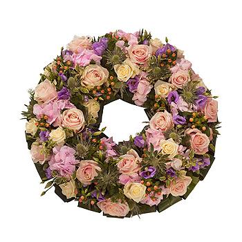 A pretty pastel wreath. Pink and cream Roses, pink Hydrangea and Hypericum are mixed with purple Lisianthus and white Eryngium.