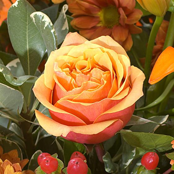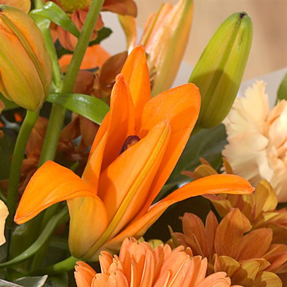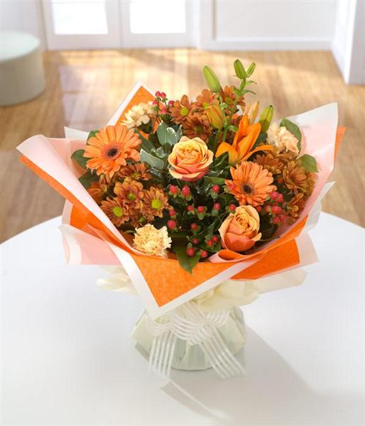 This stunning hand tied arrangement delivered in water for extra freshness in orange, red and gold mix colours.