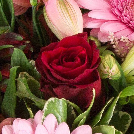 A hand-tied bouquet in a variety of deep red and pink shades encasing a single, long stemmed red rose.