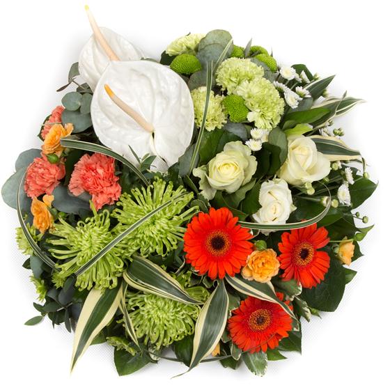 A modern sectioned posy arrangement in whites, limes and oranges.