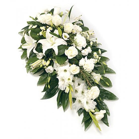A classic single ended spray of white Roses, Lilies, Eustoma and Gladioli with dark green foliage. .