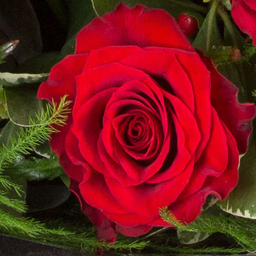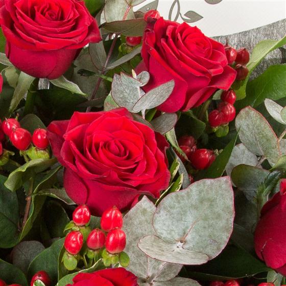 A hand-tied bouquet of six sumptuous roses encased in a selection of greenery and berries.