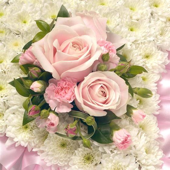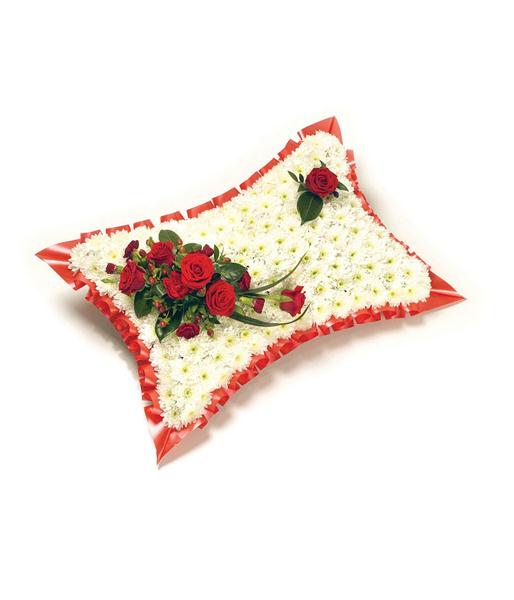 A classic white Chrysanthemum based pillow with ribbon edge. Featuring Roses, Carnations, Hypericum and complementary foliage. Picture shows Medium