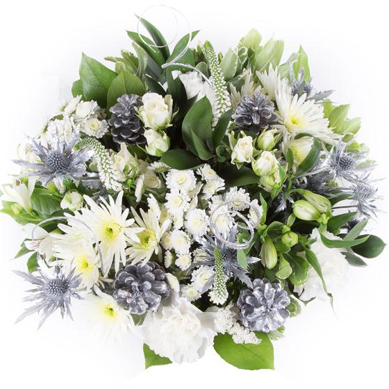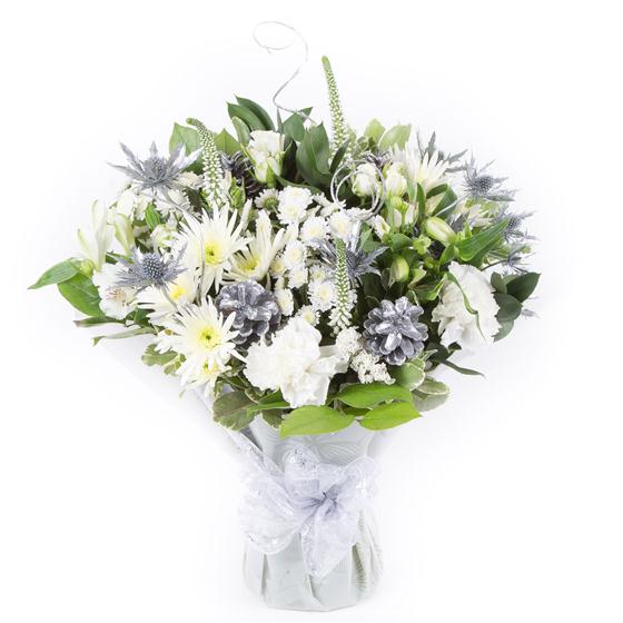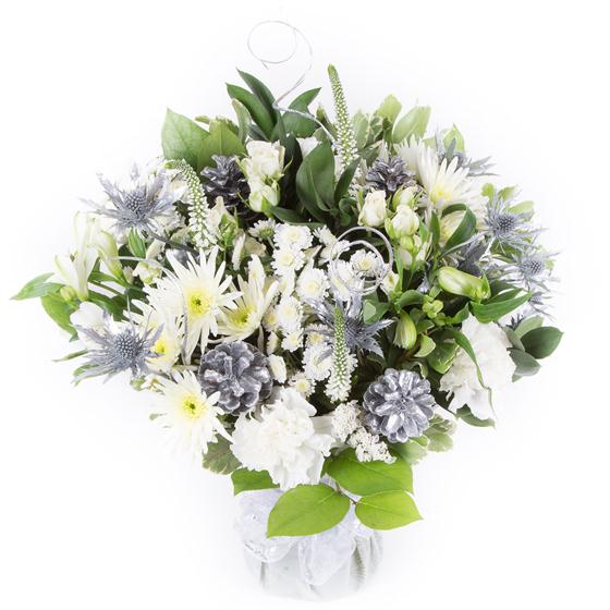 A stylish bouquet of all white blooms, including roses and carnations intermingled with silver eryngium and eucalyptus.